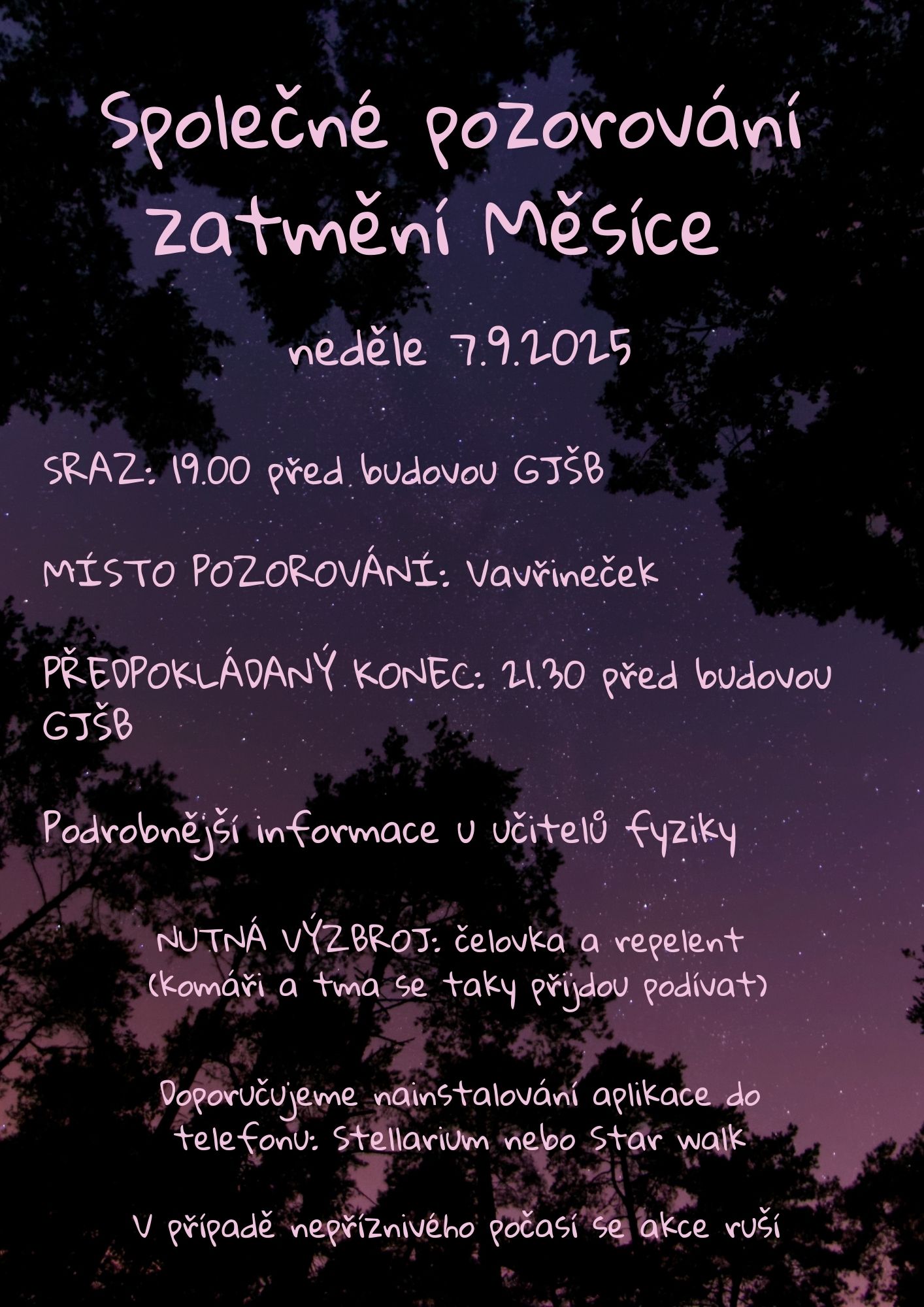 V neděli 7. 9. se spolu s učiteli vydáme na kopec Vavřineček, abychom společně sledovali zatmění Měsíce.