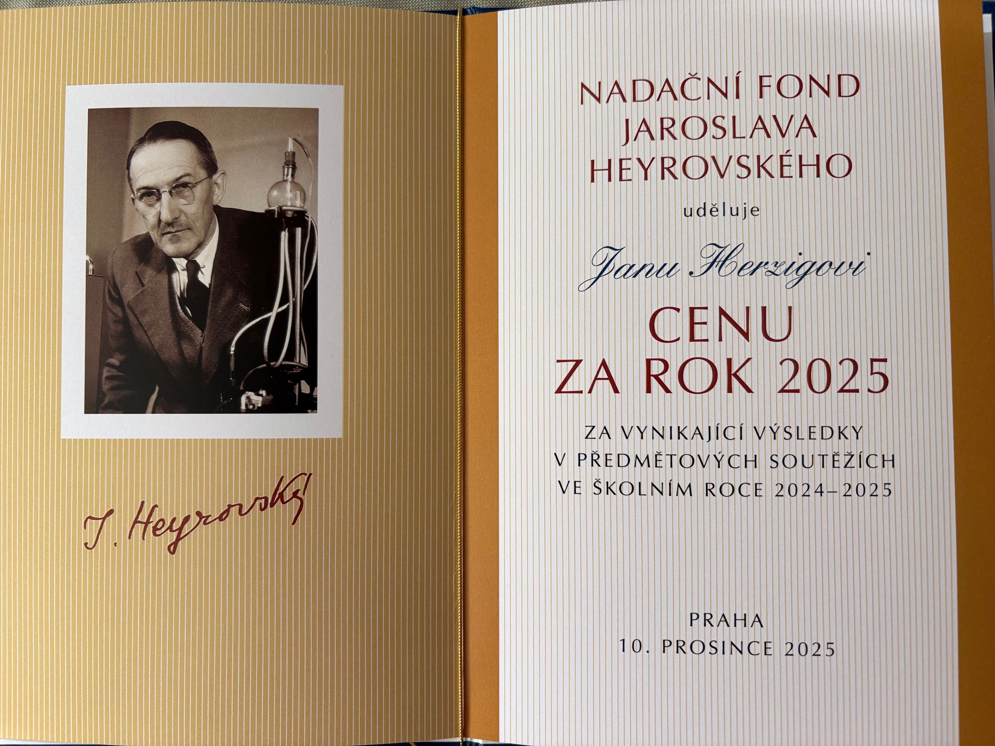 Jen o několik dní později odjížděl Jan Herzig do Prahy pro další ocenění, tentokrát do Ústavu fyzikální chemie Jaroslava Heyrovského, kde se uskutečnilo každoroční slavnostní předávání Cen Nadačního fondu Jaroslava Heyrovského vybraným středoškolským studentkám a studentům z celé České republiky.
