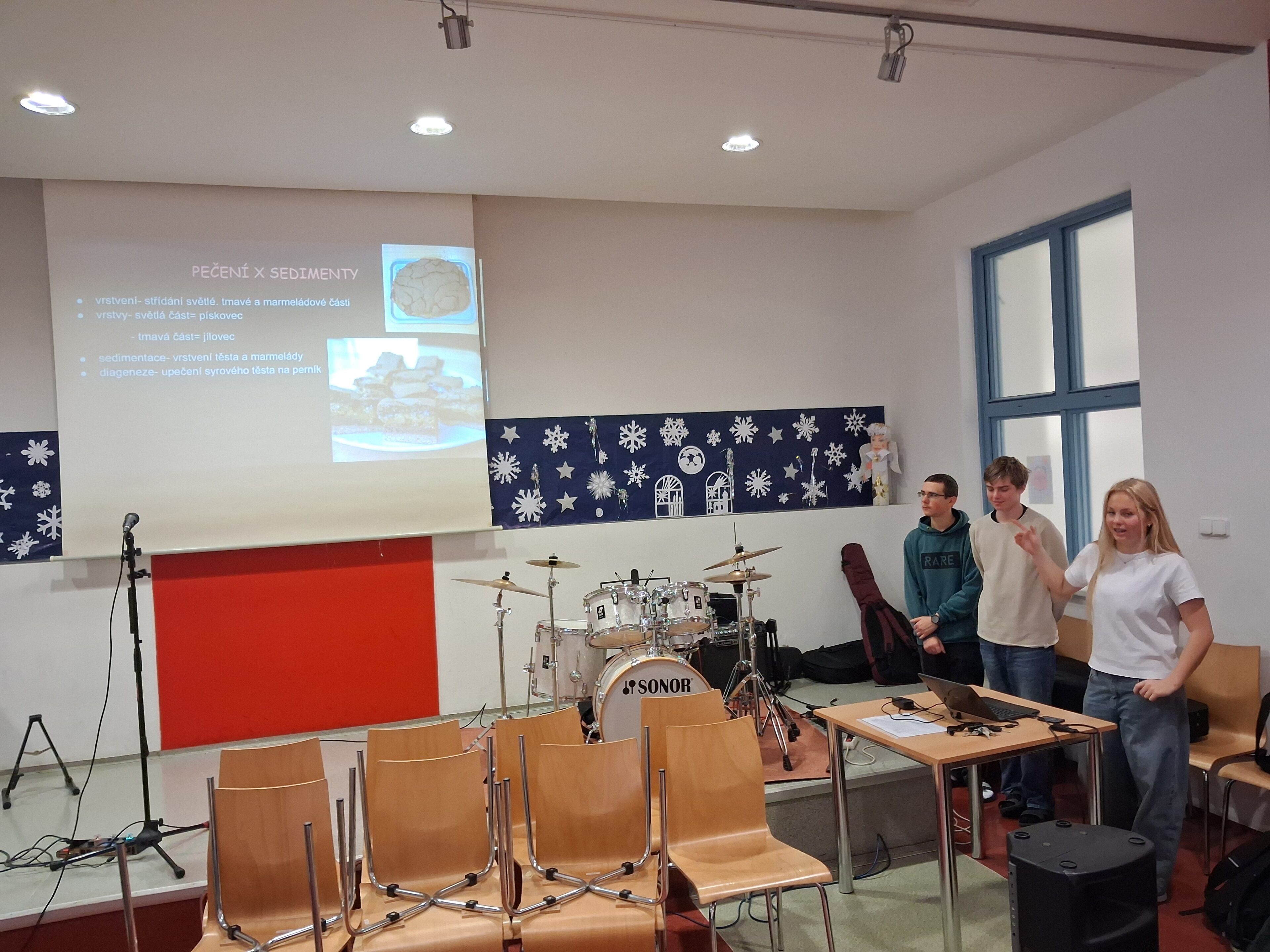 Po první hodině jsme byli nastoupení v jídelně. Každá skupina dostala přidělené pracovní místo na vaření a na prezentace. Práci jsme si rozdělili tak, že ti co chtěli spíše tvořit, pekli a ostatní vytvářeli prezentaci na dané téma. Při pečení nám velmi pomáhali paní kuchařky a naši učitelé na geologii, kteří nám radili, co máme přidat do těsta apod. Po úspěšném pečení, jsme si vždy vzali jeden z upečených artefaktů od každé skupiny a okusili jej. Mezitím probíhaly prezentace na právě ochutnávaný zákusek, který představoval daný geologický děj či těleso. Nakonec jsme si rozebrali naše dezerty, abychom se mohli pochlubit doma.