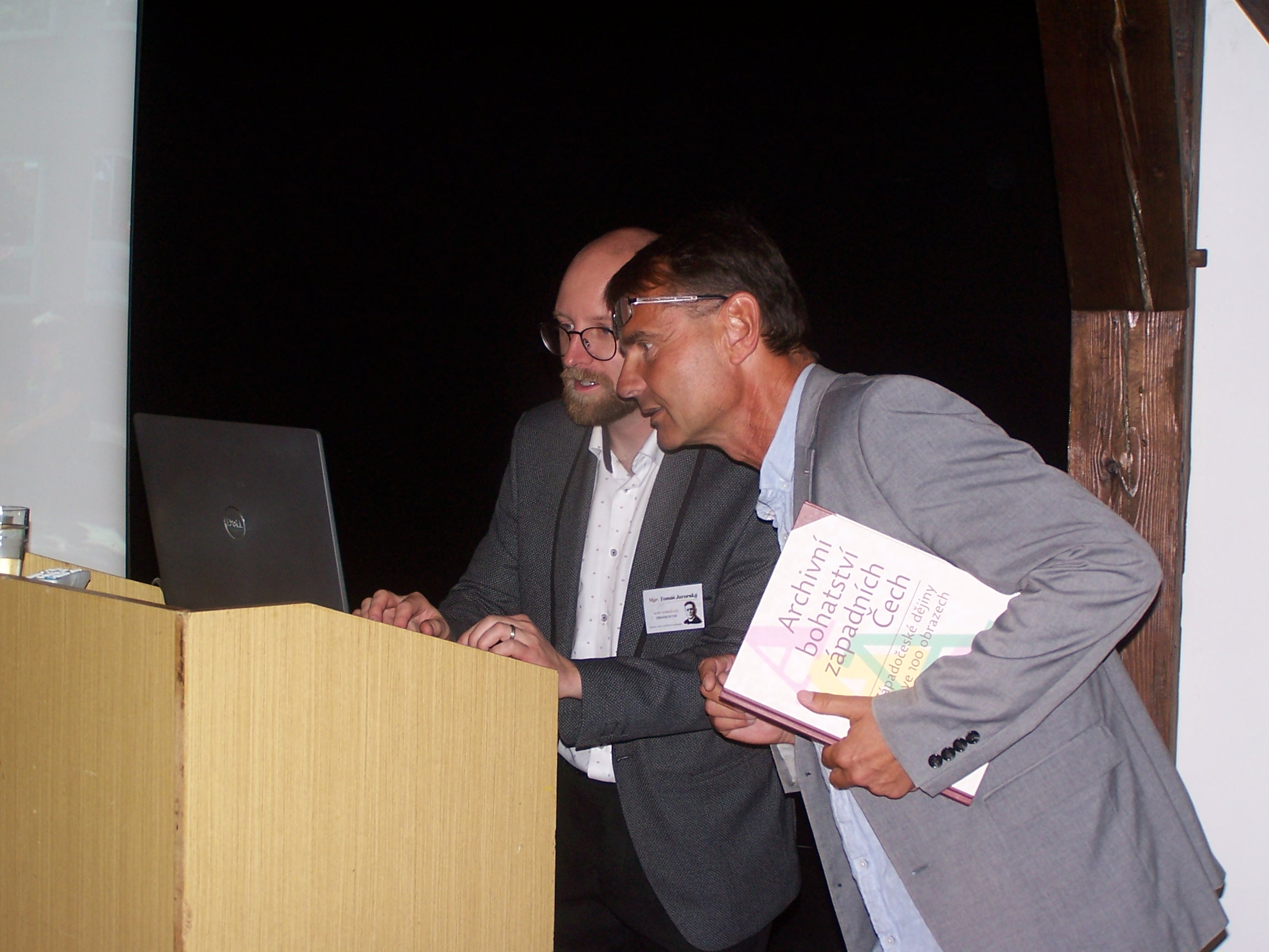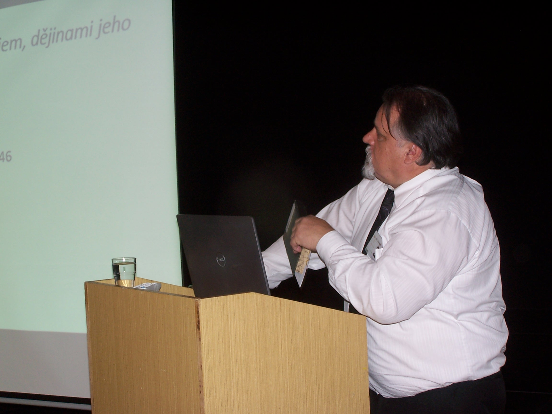 Jiný charakter měl příspěvek PhDr. Karla Řeháčka, Ph.D. (2.fotka), jenž zde reprezentoval Západočeskou univerzitu a současně i Státní oblastní archiv v Plzni. Jeho vystoupení se zaměřilo na osudy klenečských matrik v souvislosti s americkým bombardováním a následným požárem dne 26. dubna 1945.