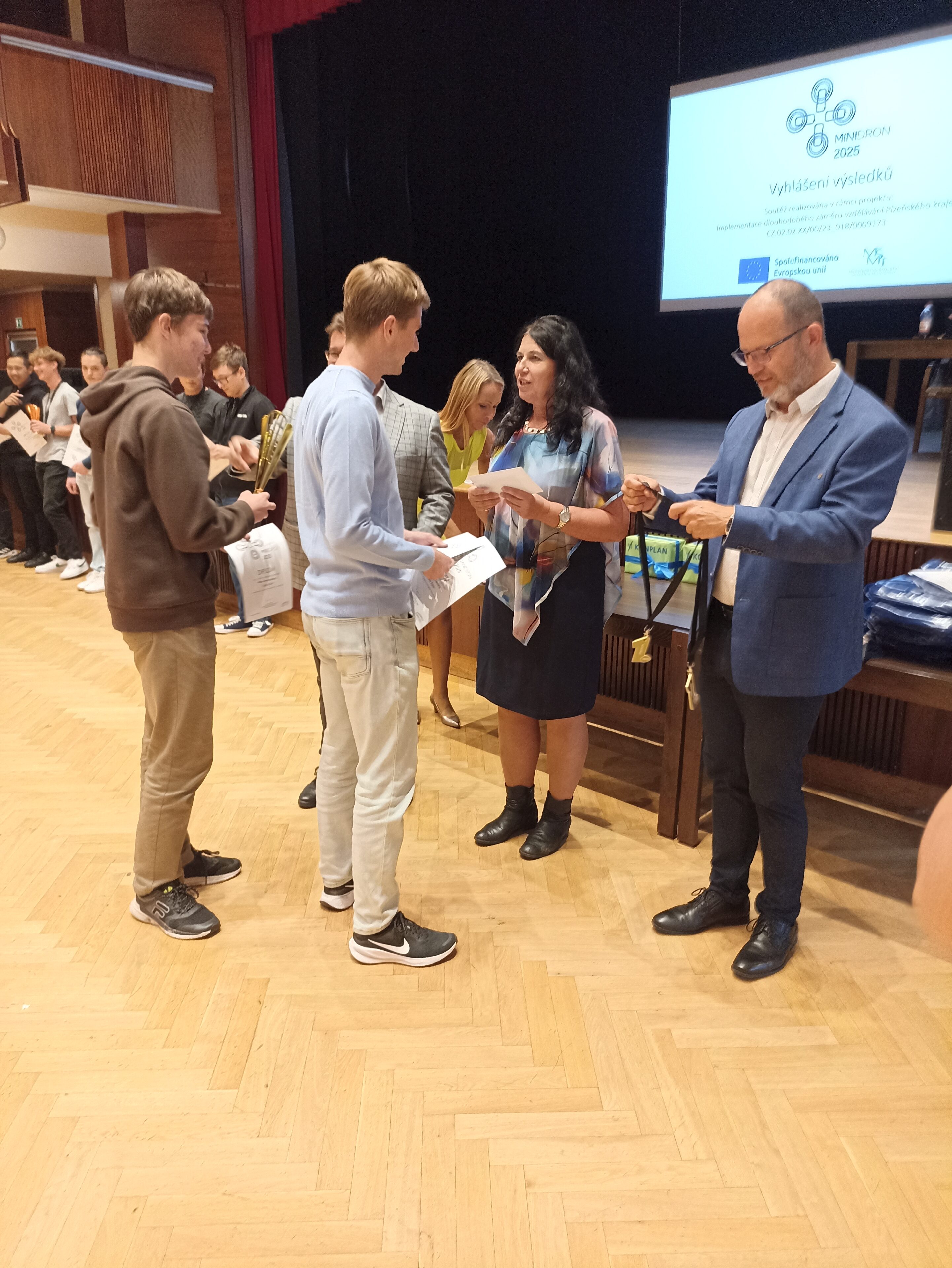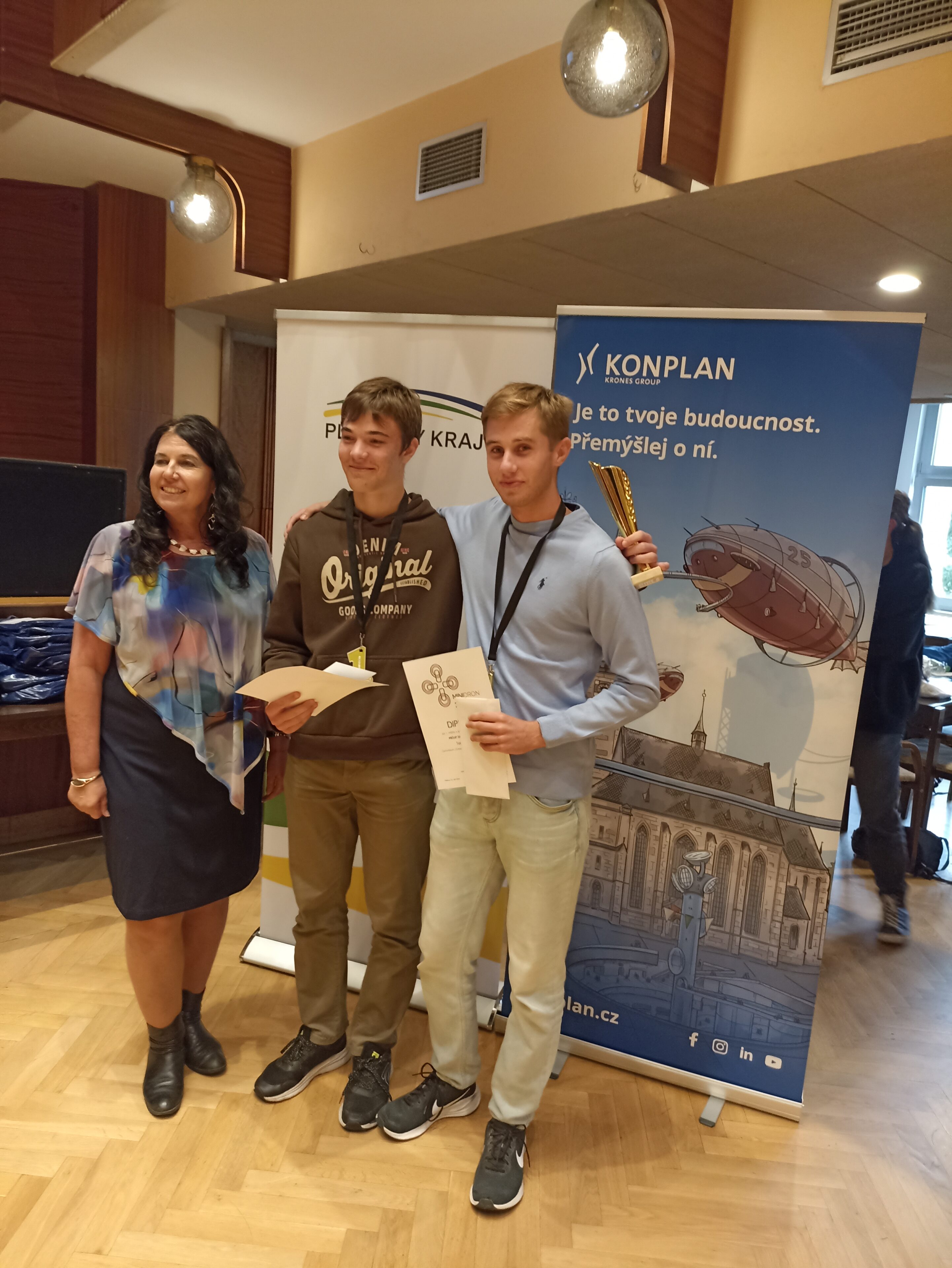 Obrovského úspěchu v podobě 1. místa ve své kategorii dosáhli v úterý 23. 9. studenti 4. ročníku O. Šipla (8.8) a T. Ren (6.6) v krajské soutěži MINIDRON 2025, která se uskutečnila v kulturním domě v Klatovech pod hlavičkou Plzeňského kraje, kdy si nejlépe poradili s nástrahami dráhy a proletěli celou trasu v rekordním čase.