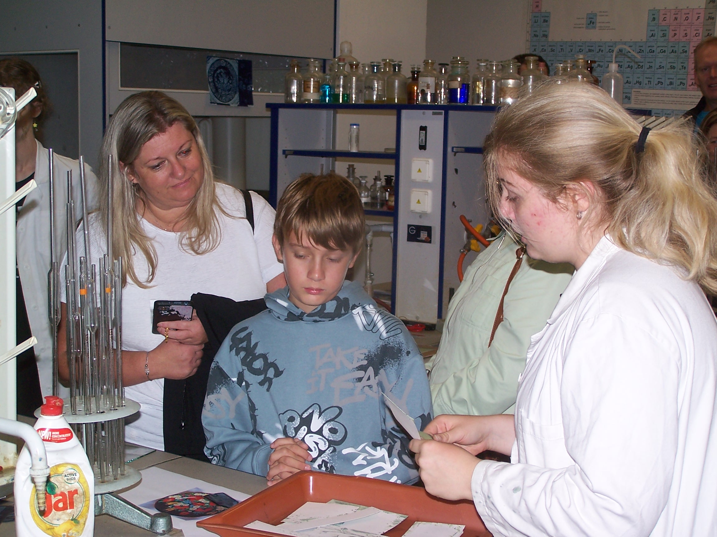 Do této činnosti se zapojili se stejným zápalem děti i jejich rodiče. Není to nic příliš složitého. Měděný plíšek odmastíme v roztoku octa se solí, opláchneme vodou a osušíme. Poté plíšek dáme na 10 minut do lázně hydroxidu sodného se zinkem, opět opláchneme vodou a osušíme. Pak opálíme nad plamenem a ze zinkem obalené mědi se nakonec stane mosaz.