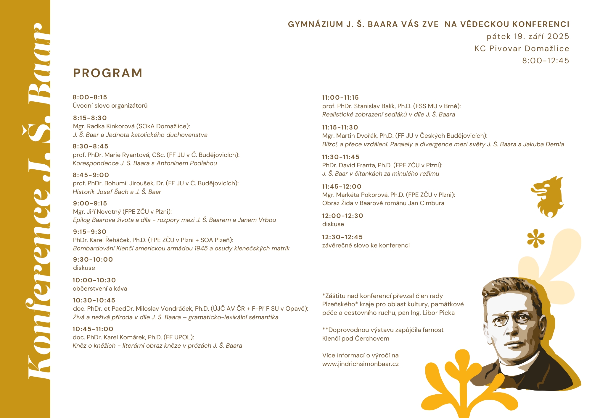 Dovolujeme si Vás pozvat na akci pořádanou ke 100. výročí úmrtí J. Š. Baara – vědeckou konferenci, která se uskuteční 19. září 2025 v KC Pivovar v Domažlicích. Tato konference má za úkol odborně připomenout některé aspekty Baarova života a jeho tvorby. Divácká účast je možná bez předchozí registrace.