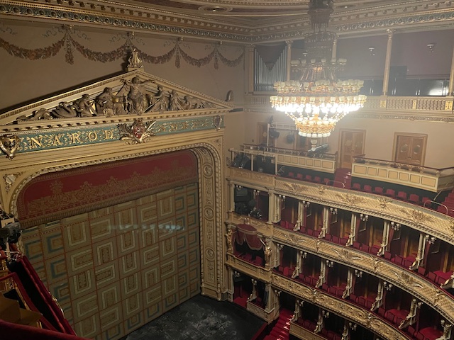 Všichni jsme si uvědomovali slavnostní atmosféru večera, a tak jsme se snažili, aby i naše oblečení odpovídalo významu této kulturní události. Usazeni jsme byli úplně nahoře ve druhé galerii. Nejprve jsme byli trochu zaskočení, zejména ti z nás, kteří mají strach z výšek. Nakonec se však ukázalo, že to byla skvělá místa – měli jsme jedinečný výhled na celé divadlo a mohli nechat na sebe působit kouzlo tohoto historického prostoru. Obdivovali jsme krásu výzdoby sálu, impozantní lustr a nádherný strop s múzami. Jediné, co nás trochu mrzelo, bylo, že jsme neviděli Hynaisovu oponu.